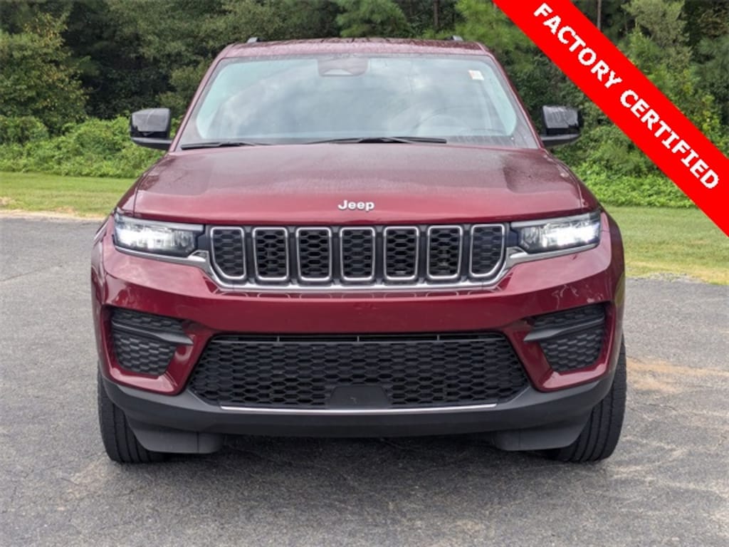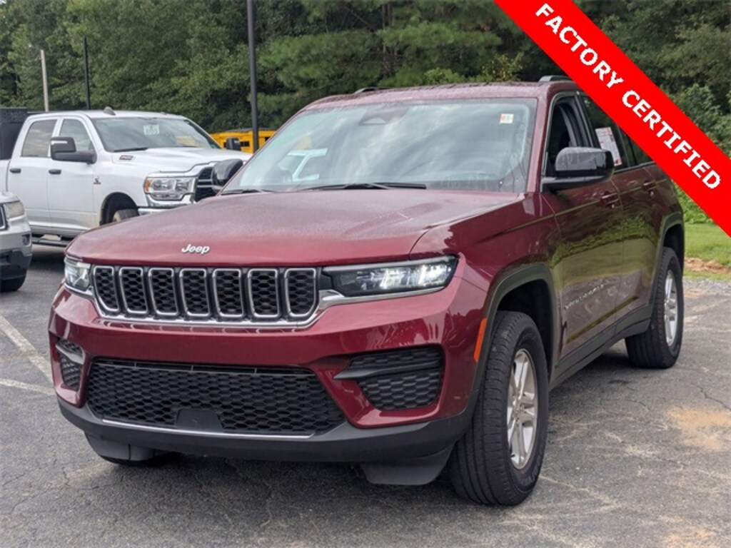***FACTORY CHRYSLER CERTIFIED***, CLEAN CARFAX, ONE OWNER, BALANCE OF FACTORY WARRANTY, LIFETIME ENGINE GUARANTEE, 4WD, FAST AND EASY FINANCING, THE NEW PRICE OUTLET, FCA US LLC Certified Pre-Owned Certified, 4WD, Quick Order Package 23A Laredo, 3.45 Rear Axle Ratio, 4-Wheel Disc Brakes, 6 Speakers, ABS brakes, Air Conditioning, Alloy wheels, Anti-whiplash front head restraints, Automatic temperature control, Brake assist, Bumpers: body-color, Cloth Seats, Compass, Delay-off headlights, Driver door bin, Driver vanity mirror, Dual front impact airbags, Dual front side impact airbags, Electronic Stability Control, Emergency communication system, Four wheel independent suspension, Front anti-roll bar, Front Bucket Seats, Front Center Armrest w/Storage, Front dual zone A/C, Front License Plate Bracket, Front reading lights, Fully automatic headlights, Heated door mirrors, Illuminated entry, Knee airbag, Low tire pressure warning, Molded In Color Black/Gloss Black Roof Rails, Normal Duty Suspension, Occupant sensing airbag, Outside temperature display, Overhead airbag, Overhead console, Panic alarm, ParkView Rear Back-Up Camera, Passenger door bin, Passenger vanity mirror, Power door mirrors, Power driver seat, Power steering, Power windows, Radio data system, Radio: Uconnect 5 w/8.4" Display, Rear anti-roll bar, Rear reading lights, Rear window defroster, Rear window wiper, Remote keyless entry, Security system, Speed control, Speed-Sensitive Wipers, Split folding rear seat, Spoiler, Steering wheel mounted audio controls, Tachometer, Telescoping steering wheel, Tilt steering wheel, Traction control, Trip computer, Variably intermittent wipers, Voltmeter, Wheels: 17" x 6.5" Fully Painted Aluminum, 4WD, Quick Order Package 23A Laredo. Velvet Red Pearlcoat 2023 Jeep Grand Cherokee Laredo 4WD 8-Speed Automatic 3.6L V6 24V VVT 19/26 City/Highway MPG 19/26 City/Highway MPG