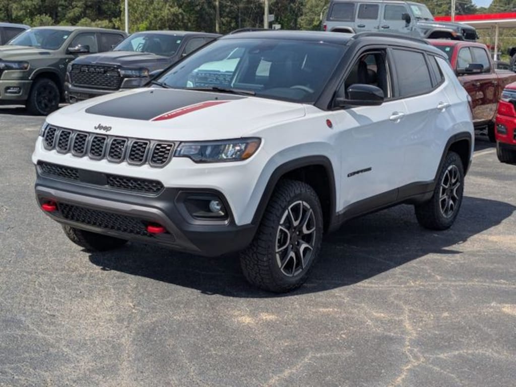 Bright White Clearcoat 2026 Jeep Compass Trailhawk 4WD 8-Speed Automatic 2.0L I4 DOHC 4WD, 10.1" Touchscreen Display, 4-Wheel Disc Brakes, 4.398 Final Drive Ratio, 4G LTE Wi-Fi Hot Spot, 6 Speakers, ABS brakes, Air Conditioning, Alexa Built-In, Alloy wheels, AM/FM radio: SiriusXM, Auto High-beam Headlights, Auto-dimming Rear-View mirror, Automatic temperature control, Brake assist, Bumpers: body-color, Cluster 10.25" TFT Color Display, Compass, Connected Travel and Traffic Services, Delay-off headlights, Driver door bin, Driver vanity mirror, Dual front impact airbags, Dual front side impact airbags, Electronic Stability Control, Emergency communication system: SiriusXM Guardian, Four wheel independent suspension, Front anti-roll bar, Front Bucket Seats, Front Center Armrest w/Storage, Front dual zone A/C, Front fog lights, Front License Plate Bracket, Front reading lights, Fully automatic headlights, Global Telematics Box Module, GPS Navigation, HD Radio, Heated door mirrors, Heated front seats, Heated steering wheel, Illuminated entry, Integrated Voice Command with Bluetooth, Knee airbag, Leather Shift Knob, Leather steering wheel, Low tire pressure warning, MyFlexCare Service Plan, Occupant sensing airbag, Outside temperature display, Overhead airbag, Overhead console, Panic alarm, ParkView Rear Back-Up Camera, Passenger door bin, Passenger vanity mirror, Power door mirrors, Power driver seat, Power Front/Fixed Rear Full Sunroof, Power Liftgate, Power steering, Power windows, Premium Alpine Speaker System, Premium audio system: UConnect 5, Premium Cloth/Leather Trim Bucket Seats, Quick Order Package 29E, Radio: Uconnect 5 with 10.1" Display, Rain sensing wipers, Rear anti-roll bar, Rear seat center armrest, Rear window defroster, Rear window wiper, Remote keyless entry, Security system, SiriusXM Guardian - Included Trail (B), SiriusXM Radio Service, SiriusXM with 360L, Speed control, Split folding rear seat, Spoiler, Steering wheel mounted audio controls, Sun, Sound and Navigation Group, Tachometer, Telescoping steering wheel, Tilt steering wheel, Traction control, Trip computer, Turn signal indicator mirrors, Variably intermittent wipers, Wheels: 17" x 6.5" Painted Black Aluminum, 4WD.