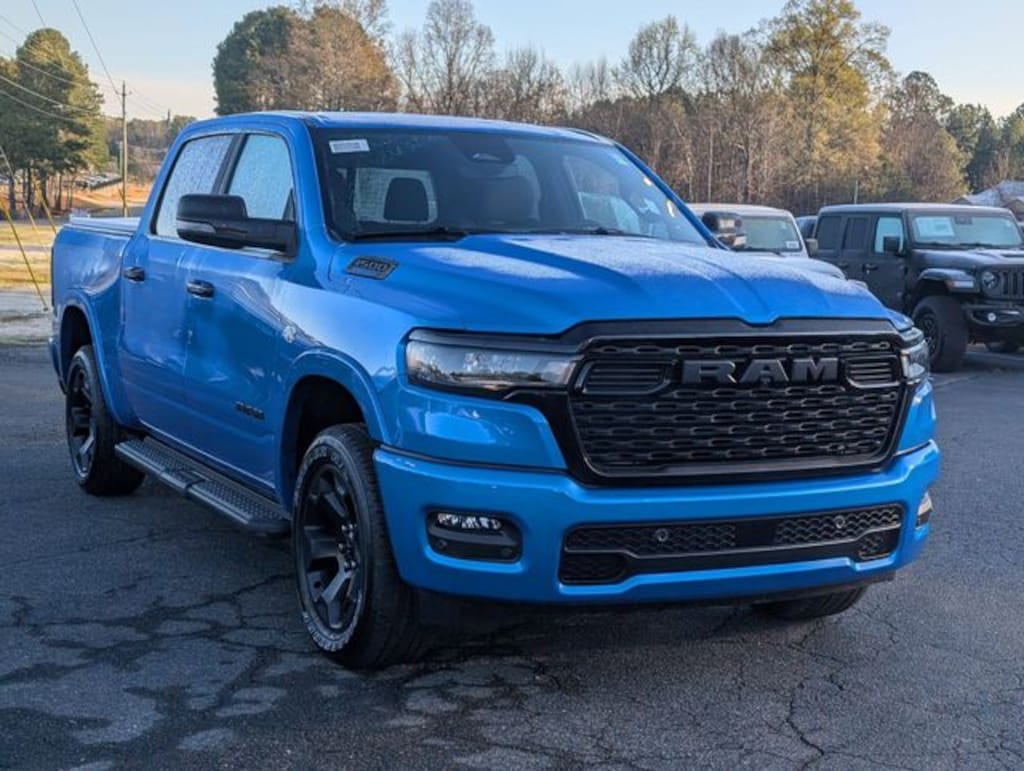 Hydro Blue Pearlcoat 2026 Ram 1500 Big Horn/Lone Star 4WD 8-Speed Automatic HEMI 5.7L V8 Multi Displacement VVT eTorque 115V Auxiliary Power Outlet, 2nd Row in Floor Storage Bins, 3 Rear Seat Head Restraints, 4 Way Front Headrests, 4-Wheel Disc Brakes, 400W Inverter, 48V Belt Starter Generator, 4G LTE Wi-Fi Hot Spot, 6 Speakers, ABS brakes, Accent Color Door Handles, Accent Color Premium Power Mirrors, Accent Color Tailgate Handle, Air Conditioning, Alloy wheels, AM/FM radio, Anti-Spin Differential Rear Axle, Apple CarPlay, Apple CarPlay/Android Auto, Auto High-beam Headlights, Auto Power-Folding Mirrors, Auto-Dimming Exterior Driver Mirror, Auto-Dimming Rear-View Mirror, Bed Utility Group, Big Horn Level 1 Equipment Group, Black Exterior Mirrors, Black Exterior Truck Badging, Black Headlamp Bezels, Black Interior Accents, Black Painted Exterior Mirrors Caps, Black Premium Power Mirrors, Black Tail Lamp Bezels, Body Color Fender Flares, Body Color Front Bumper, Body Color Rear Bumper with Step Pads, Brake assist, Bucket Seats, Bumpers: chrome, Center Console Parts Module, Cloth Bucket Seats, Compass, Connectivity - US/Canada, Convex Wide-Angle Exterior Mirror Insert, Delay-off headlights, Deluxe Cloth Bucket Seats, Driver door bin, Dual Exhaust with Black Tips, Dual front impact airbags, Dual front side impact airbags, Electronic Stability Control, Exterior 115V AC Outlet, Exterior Mirrors Courtesy Lamps, Exterior Mirrors with Heating Element, Exterior Mirrors with Supplemental Signals, Front anti-roll bar, Front Bucket Seats, Front Center Armrest w/Storage, Front fog lights, Front License Plate Bracket, Front reading lights, Front Seat Back Map Pockets, Front wheel independent suspension, Full Length Floor Console, Fully automatic headlights, Global Telematics Box Module, Glove Box Lamp, Google Android Auto, GPS Antenna Input, Grille Black Surround Black Mesh, Heated door mirrors, Heated Front Seats, Heated Steering Wheel, Illuminated entry, Integrated Center Stack Radio, Integrated Voice Command with Bluetooth, Leather Wrapped Steering Wheel, Low tire pressure warning, Manual Adjust 4-Way Driver Seat, Manual Adjust 4-Way Front Passenger Seat, Manual Folding Exterior Mirrors, MOPAR 4 Adjustable Cargo Tie-Down Hooks, Mopar Black Tubular Side Steps, MOPAR Spray in Bedliner, MyFlexCare Service Plan, Night Edition, Occupant sensing airbag, Outside temperature display, Overhead airbag, Overhead console, Panic alarm, ParkView Rear Back-Up Camera, Passenger door bin, Passenger vanity mirror, Pick-Up Box Lighting, Power 2-Way Driver Lumbar Adjust, Power Adjust 8-Way Driver Seat, Power Adjustable Pedals, Power door mirrors, Power steering, Power windows, Quick Order Package 27Z Big Horn, Radio data system, Radio: Uconnect 5 W with 8.4" Display, RAM Grille Badge - Black, RAM Grille Badge - Chrome, Rear 60/40 Folding Seat, Rear anti-roll bar, Rear Center Armrest, Rear Dome with on/Off Switch Lamp, Rear Power Sliding Window, Rear step bumper, Rear Window Defroster, Remote keyless entry, SiriusXM Radio Service, SiriusXM Satellite Radio, Speed control, Steering Wheel Mounted Audio Controls, Sun Visors with Illuminated Vanity Mirrors, Supplier Part Tracking (J-1), Tachometer, Telescoping steering wheel, Tilt steering wheel, Traction control, Tri-Fold Tonneau Cover, Trip computer, Universal Garage Door Opener, USB Host Flip, Variably intermittent wipers, Voltmeter, Wheels: 20" x 9.0" Aluminum Painted Clad.