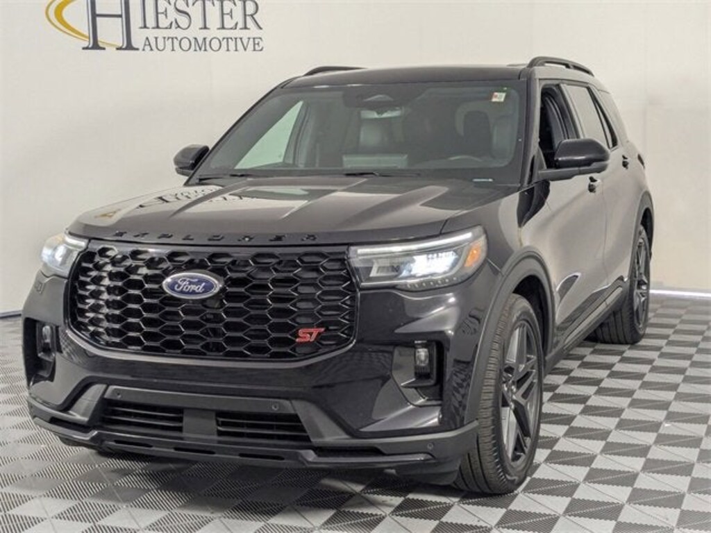 Black Metallic 2025 Ford Explorer ST 4WD 10-Speed Automatic 3.0L EcoBoost V6ACCIDENT FREE CARFAX, LIFETIME ENGINE GUARANTEE, 4WD/AWD, POWER SUNROOF/MOONROOF, THIRD ROW SEATING, APPLE CARPLAY/ANDROID AUTO, HEATED/VENTILATED SEATS, REAR BACKUP CAMERA, Bluetooth® HANDS FREE, NAVIGATION/GPS, LEATHER, PASSED OUR RIGOROUS SERVICE INSPECTION, FAST AND EASY FINANCING, ***SAVE MORE WHEN YOU TRADE WITH HIESTER CHEVROLET!***, 4WD, Equipment Group 400A Standard Package, Power Liftgate, 10 Speakers, 3.58 Non-Limited Slip Rear Axle, 3rd row seats: bench, 4-Wheel Disc Brakes, ABS brakes, Air Conditioning, Alloy wheels, AM/FM radio: SiriusXM with 360L, Apple CarPlay/Android Auto, Auto High-beam Headlights, Auto-dimming door mirrors, Auto-dimming Rear-View mirror, Automatic temperature control, Brake assist, Bumpers: body-color, Compass, Delay-off headlights, Driver door bin, Driver vanity mirror, Dual front impact airbags, Dual front side impact airbags, Electronic Stability Control, Emergency communication system: 911 Assist, Exterior Parking Camera Rear, Four wheel independent suspension, Front anti-roll bar, Front Bucket Seats, Front Center Armrest, Front dual zone A/C, Front fog lights, Front reading lights, Fully automatic headlights, Garage door transmitter, Heated door mirrors, Heated front seats, Heated rear seats, Heated steering wheel, Heated/Ventilated Miko Sport Captain's Chairs, Illuminated entry, Knee airbag, Leather steering wheel, Low tire pressure warning, Memory seat, Navigation System, Occupant sensing airbag, Outside temperature display, Overhead airbag, Overhead console, Panic alarm, Passenger door bin, Passenger vanity mirror, Power door mirrors, Power driver seat, Power passenger seat, Power steering, Power windows, Radio: B&O Sound System by Bang & Olufsen, Rain sensing wipers, Rear air conditioning, Rear anti-roll bar, Rear reading lights, Rear window defroster, Rear window wiper, Remote keyless entry, Security system, Speed control, Speed-sensing steering, Speed-Sensitive Wipers, Split folding rear seat, Spoiler, Sport steering wheel, Steering wheel mounted audio controls, Tachometer, Telescoping steering wheel, Tilt steering wheel, Traction control, Trip computer, Turn signal indicator mirrors, Variably intermittent wipers, Ventilated front seats, 4WD, Equipment Group 400A Standard Package, Power Liftgate.****Thank you for choosing John Hiester Chevrolet. Proudly serving Fuquay Varina, Holly Springs, Cary, Apex, Raleigh, Durham, Fayetteville, Sanford, Pinehurst, Southern Pines, Pittsboro, Lillington, Angier, Dunn, Erwin, Benson, and surrounding areas. The team is excited and dedicated to making sure every customer has an unparalleled buying experience. Elevate your driving experience today! Ask us about our pre-owned vehicles that come with our Dealership for Life benefits. With over 1000 exceptional vehicles to choose from and the ability to acquire every used make and model, we are confident you, your family and friends will be 100% satisfied with the service, selection, and deals. Many of our customers love the off-site test drives we offer and at home deliveries. ****Please call us at 919-346-6312*** and experience world class customer service. Get off your Kiester and come to Hiester! All pricing and details are believed to be accurate, but we do not warrant or guarantee such accuracy. Price excludes Tax, Title and $799 processing fee. See dealer for details.Priced below KBB Fair Purchase Price! 18/25 City/Highway MPG
