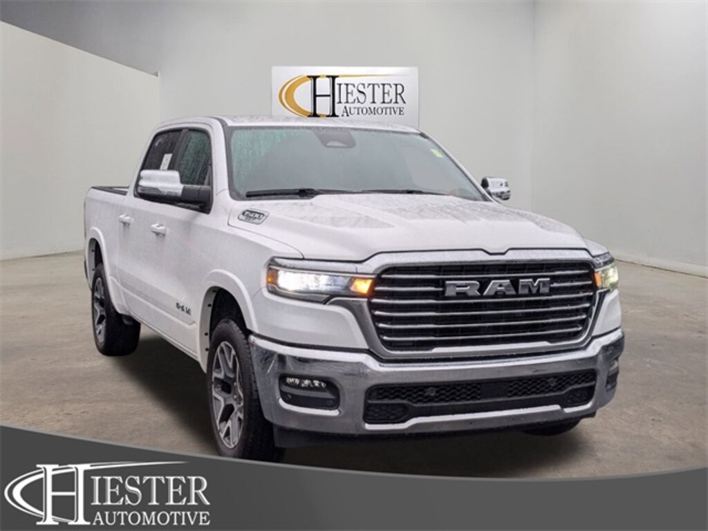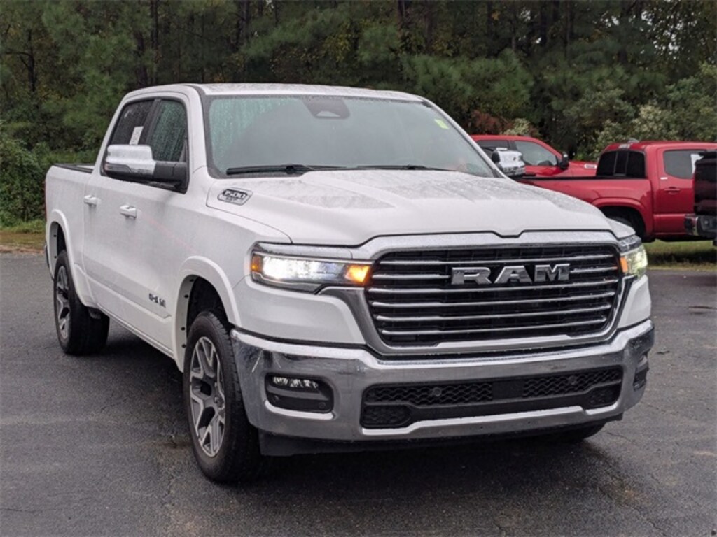 10 Speakers, 3 Rear Seat Head Restraints, 3.55 Rear Axle Ratio, 4 Way Front Headrests, 4-Wheel Disc Brakes, 4G LTE Wi-Fi Hot Spot, ABS brakes, Air Conditioning, Alloy wheels, AM/FM radio: SiriusXM with 360L, Apple CarPlay, Apple CarPlay/Android Auto, Audio memory, Auto High-beam Headlights, Auto Power-Folding Mirrors, Auto-dimming door mirrors, Auto-Dimming Exterior Driver Mirror, Auto-dimming Rear-View mirror, Automatic temperature control, Brake assist, Bumpers: chrome, Chrome Exterior Mirrors, Compass, Connected Travel & Traffic Services, Connectivity - US/Canada, Convex Wide-Angle Exterior Mirror Insert, Delay-off headlights, Driver door bin, Driver Seat Memory, Driver vanity mirror, Dual front impact airbags, Dual front side impact airbags, Electronic Stability Control, Exterior Mirrors Courtesy Lamps, Exterior Mirrors w/Heating Element, Exterior Mirrors w/Memory, Exterior Mirrors w/Supplemental Signals, Front anti-roll bar, Front Center Armrest w/Storage, Front dual zone A/C, Front fog lights, Front License Plate Bracket, Front reading lights, Front Seat Back Map Pockets, Front wheel independent suspension, Fully automatic headlights, Garage door transmitter, Google Android Auto, GPS Antenna Input, GPS Navigation, HD Radio, Heated door mirrors, Heated Front Seats, Heated front seats, Heated rear seats, Heated Steering Wheel, Heated steering wheel, Illuminated entry, Integrated Voice Command w/Bluetooth, Leather steering wheel, Leather Trim 40/20/40 Bench Seat, Low tire pressure warning, Manufacturer's Statement of Origin, Memory seat, Navigation System, Occupant sensing airbag, Outside temperature display, Overhead airbag, Overhead console, Panic alarm, ParkView Rear Back-Up Camera, Passenger door bin, Passenger vanity mirror, Power 2-Way Driver Lumbar Adjust, Power 2-Way Passenger Lumbar Adjust, Power Adjust 8-Way Front Passenger Seat, Power door mirrors, Power driver seat, Power passenger seat, Power steering, Power windows, Quick Order Package 21H Laramie, Radio data system, Radio: Uconnect 5 Nav w/12.0" Display, RAM Grille Badge - Chrome, Rear anti-roll bar, Rear reading lights, Rear seat center armrest, Rear step bumper, Remote keyless entry, Security system, SiriusXM w/360L, Speed control, Split folding rear seat, Steering wheel mounted audio controls, Tachometer, Telescoping steering wheel, Tilt steering wheel, Traction control, Trip computer, Turn signal indicator mirrors, USB Host Flip, Variably intermittent wipers, Ventilated Front Seats, Ventilated front seats, Voltmeter, Wheels: 20" x 9" Premium Paint/Polish. Bright White Clearcoat 2025 Ram 1500 Laramie 4WD 8-Speed Automatic 3.0L I6 17/24 City/Highway MPG